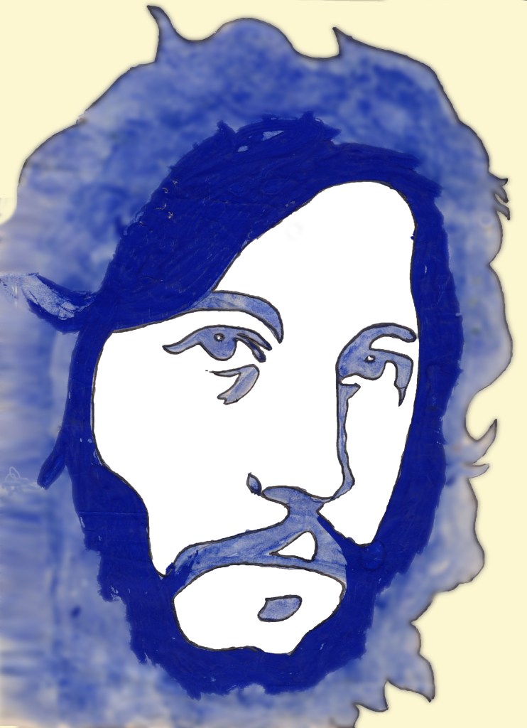 Back home I longed for Peter Green, the man I knew, my man of the world. I was working on creating an image of him for myself. I loved the Jesus look he had developed, the long hair and beard, fully complemented with white robe and sandals – ‘Jesus Boots’. I had worked up the image of Peter Green in Blue, above. I made one with silver glitter on black. I settled on my favourite of rainbow colours radiating from his mind – the forehead.